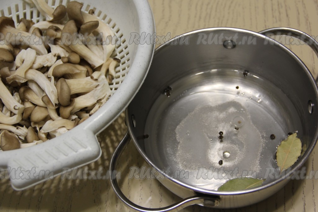Влить в кастрюлю 200 мл воды, уксус и растительное масло, добавить соль, лавровые листья, горошины перца. Вешенки срезать с плодоножки и разделить на отдельные грибочки. Промыть грибы под проточной водой.