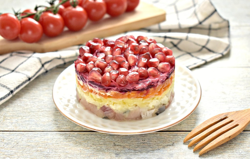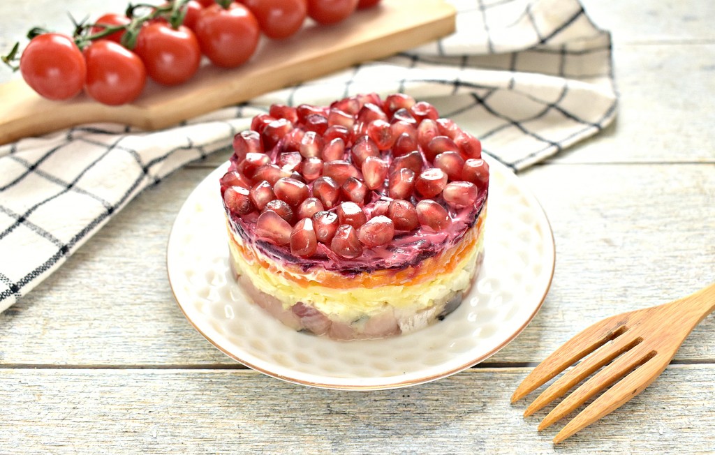 Популярный и востребованный на праздничных застольях салат «Селёдка под шубой» приобретёт новые вкусовые качества, если добавить в его состав зёрна граната. Слоёный салат получается очень вкусным, аппетитным, да ещё и ярким, благодаря гранатовым зёрнышкам. Приготовьте "Селёдку под шубой" по этому рецепту и насладитесь его интересным вкусом!