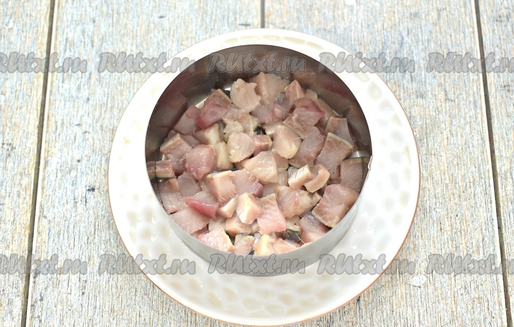 Салат выкладывается слоями. Готовить его можно в глубоком салатнике или порционно, используя креманки, или, как в моём случае, с помощью сервировочного кольца. Из указанного количества ингредиентов я готовила 3 порции салата, пропорционально раскладывая ингредиенты в сервировочные кольца. Итак, ставим сервировочное кольцо на плоскую тарелку. Филе селёдки хорошо осматриваем, удаляя косточки, если они есть. Селёдочку нарезаем на маленькие кубики и выкладываем первым слоем.