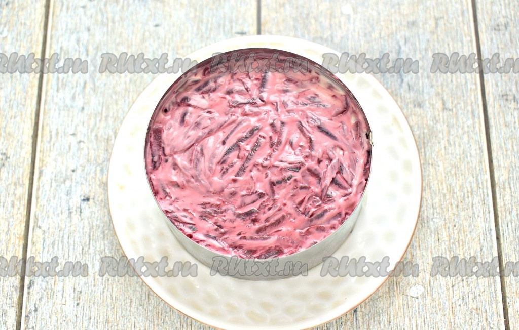 Натираем на тёрке свеклу, выкладываем её следующим слоем и покрываем майонезом.