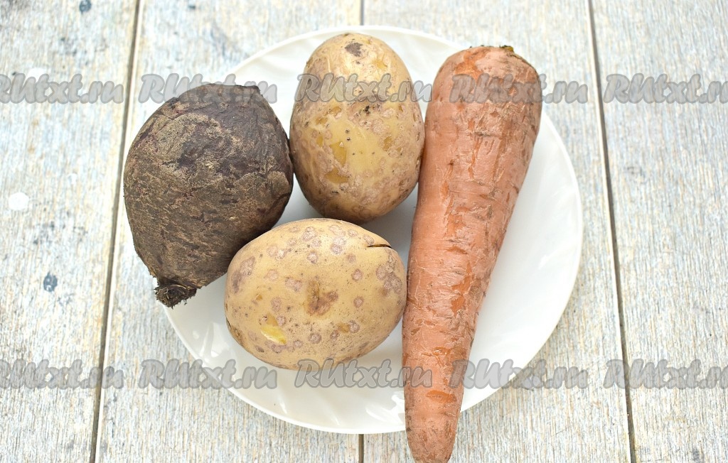 Промываем под проточной водой картофель, морковку и свеклу, чистить от кожуры их не нужно. Отвариваем картошку с морковкой до готовности (обычно с момента начала кипения воды на это требуется минут 20-25), воду в процессе варки нужно немного подсолить. Свеклу отвариваем в течение минут 40-50 после закипания воды. Отваренные овощи остужаем и очищаем от кожуры.