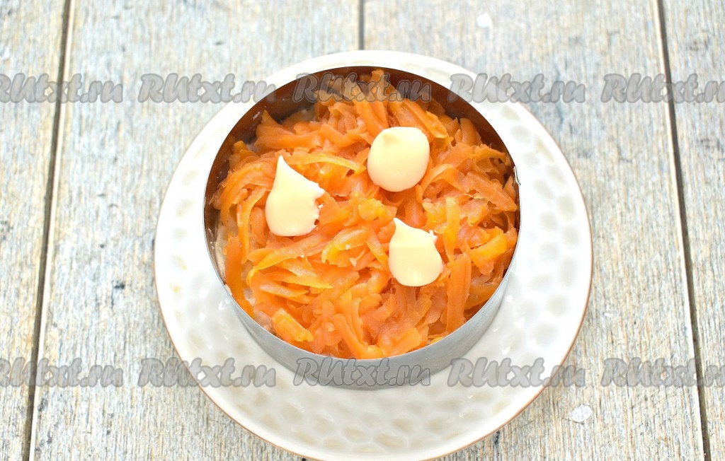Следующим слоем раскладываем натёртую морковку, её тоже смазываем майонезом.