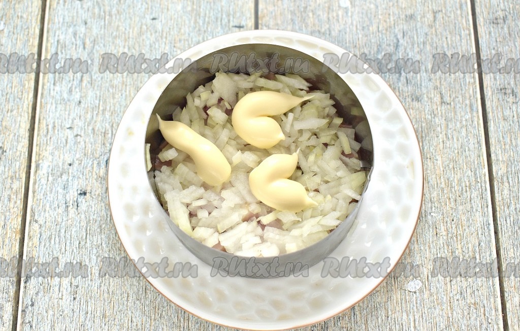 Мелко нарезаем очищенную луковицу, равномерно выкладываем следующим слоем, наносим сверху майонез.