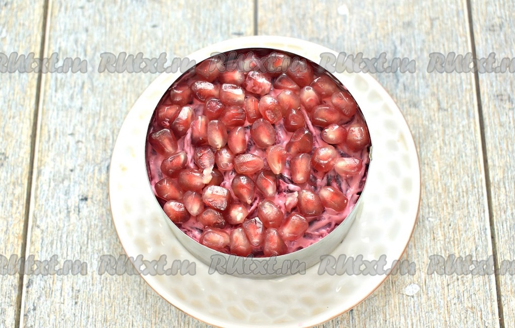Завершающий слой нашей «шубы» - зёрна граната. Очищаем гранат, располагаем зёрна на слое из свеклы.