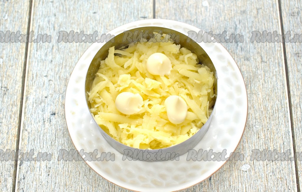 Следующим слоем равномерно выкладываем варёные картофелины, натёртые на крупной тёрке, тоже смазываем майонезом.