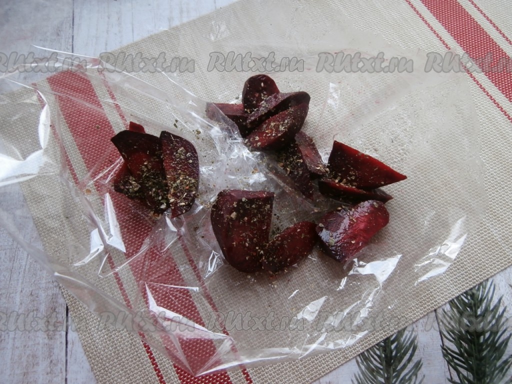 Поместить свеклу в пакет для запекания, полить её растительным маслом, посолить, посыпать специями и травами.