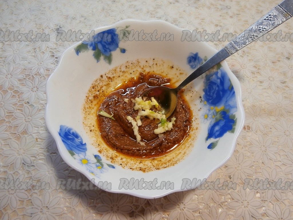 Хорошо перемешать, должна получиться пастообразная смесь, к которой добавить пропущенный через пресс чеснок.