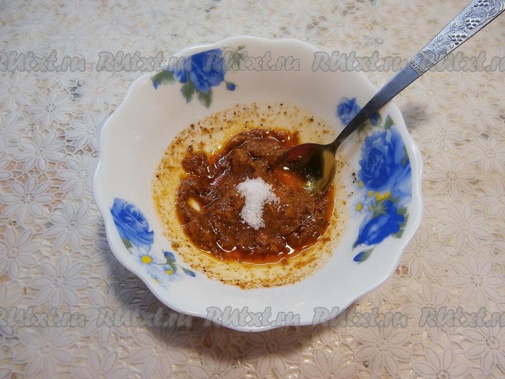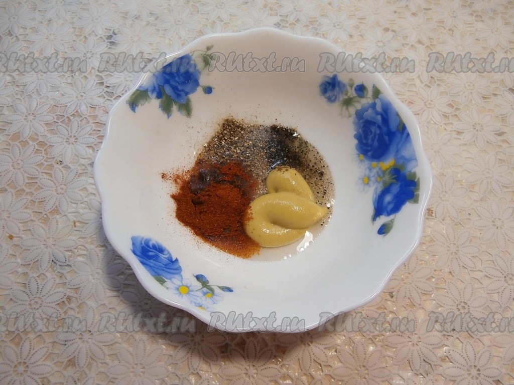 Свиную грудинку вымыть, обсушить. В небольшую посуду влить растительное масло, добавить обычную горчицу, всыпать паприку, соль, кориандр, смесь перцев.