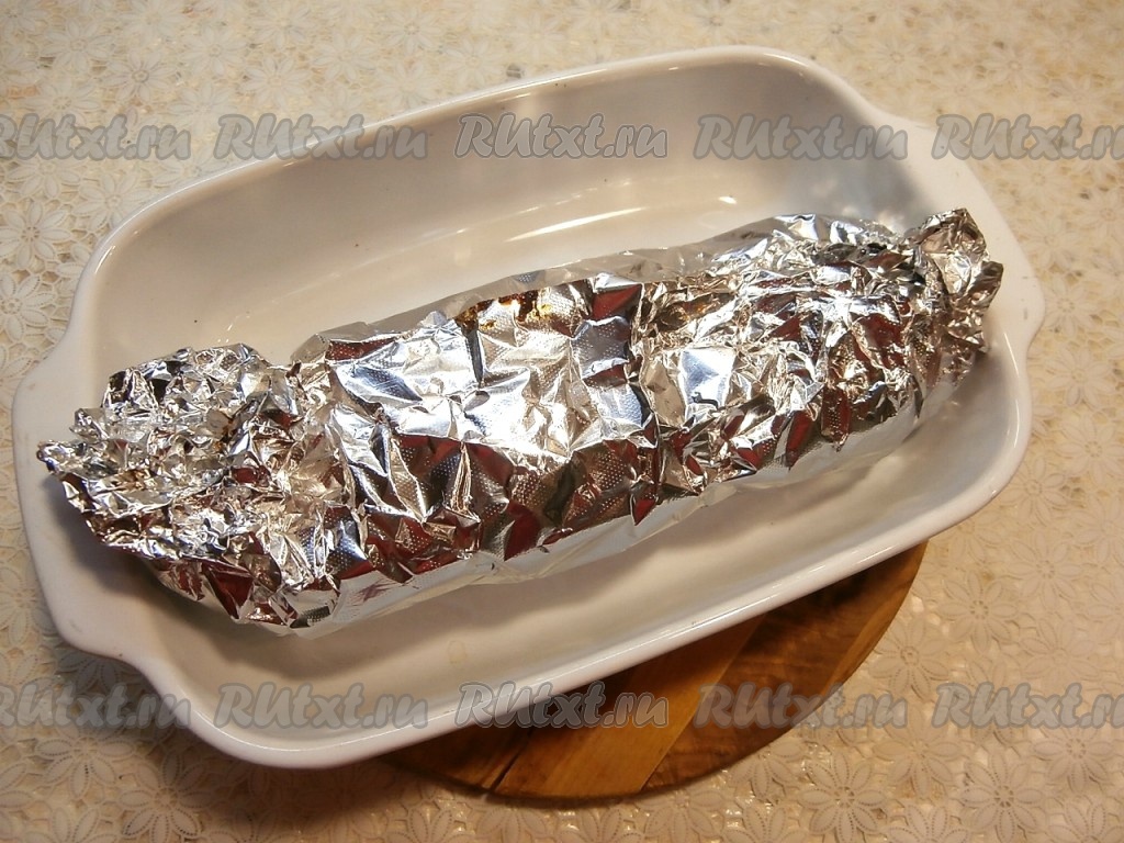 Грудинку тщательно натереть полученной смесью со всех сторон и выложить на лист фольги шкурой вниз.