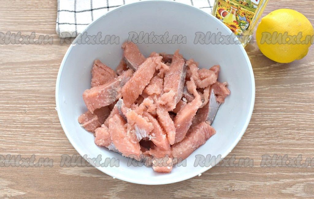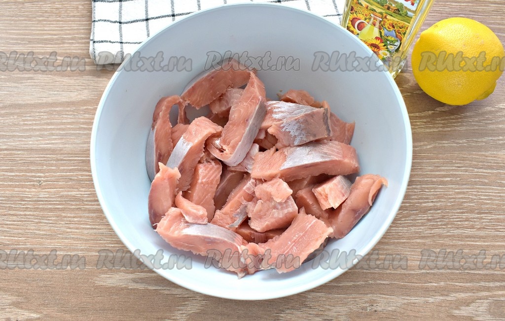 Нарезаем филе горбуши на кусочки шириной, примерно, 1,5 см. Складываем рыбные кусочки в миску.