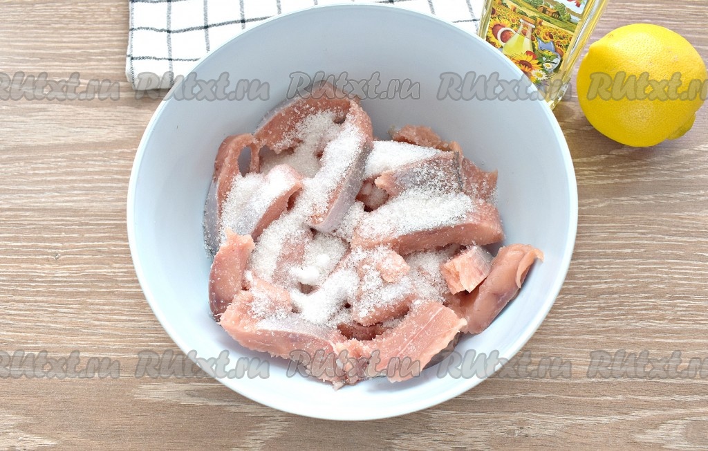 Аккуратно перемешиваем рыбу, чтобы все кусочки горбуши были равномерно покрыты солью с сахаром.
