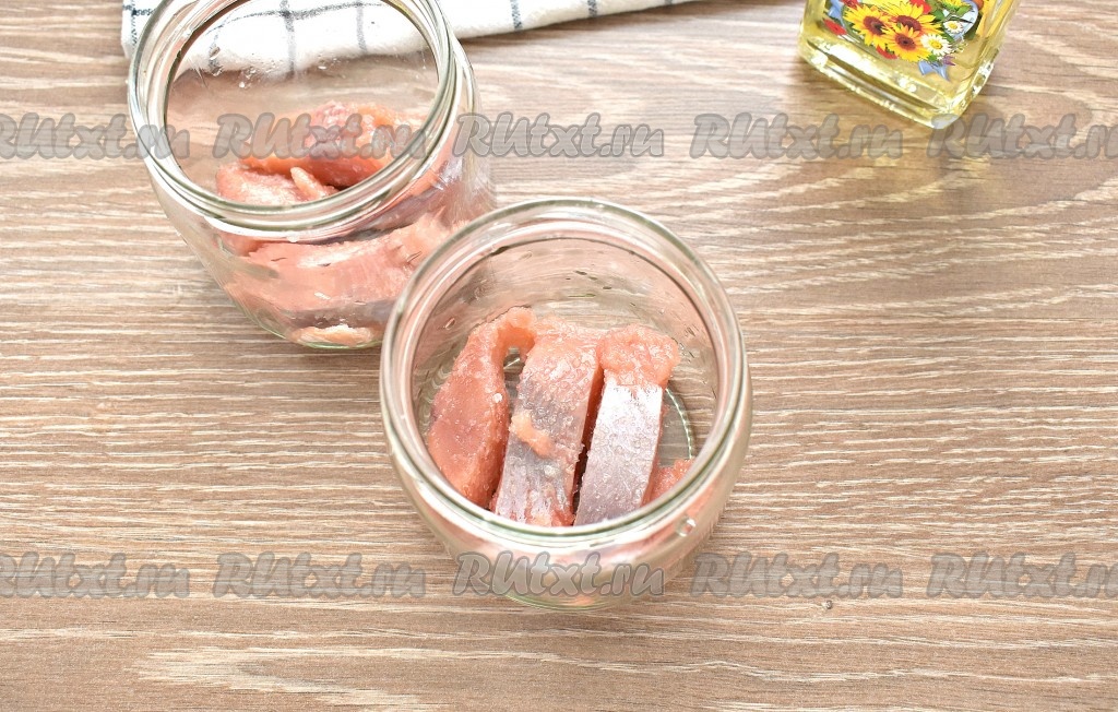 Солить горбушу по этому рецепту лучше в стеклянных банках. На дно выкладываем слой из горбуши.