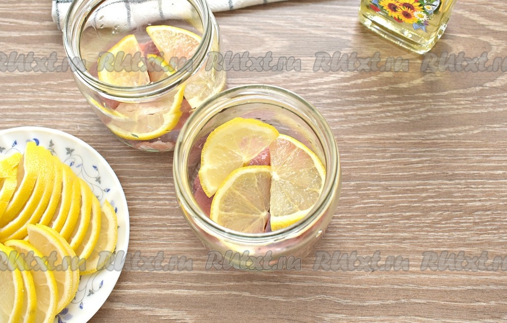 Полностью заливаем кусочки рыбы с лимоном растительным маслом. Банки закрываем крышками, убираем в холодильник. Солим горбушу в течение 24 часов.