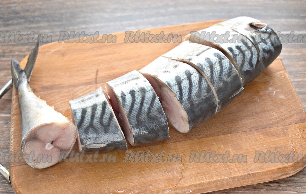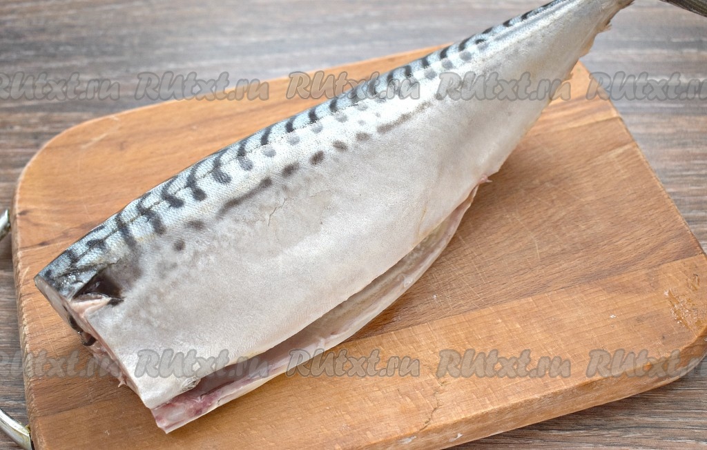 У скумбрии отрезаем плавники и голову, потрошим рыбку, удаляя из брюшка внутренности и чёрную плёнку. Хорошо промываем рыбу холодной водой.