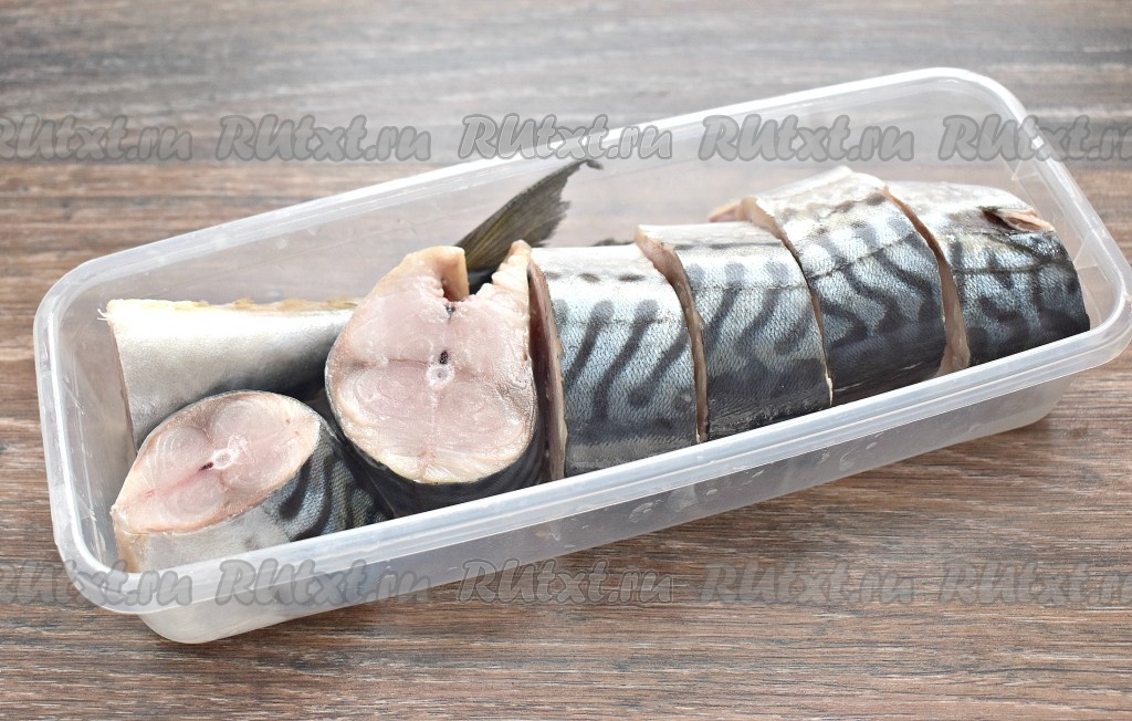 Кусочки скумбрии складываем для засолки в контейнер (или стеклянную банку).