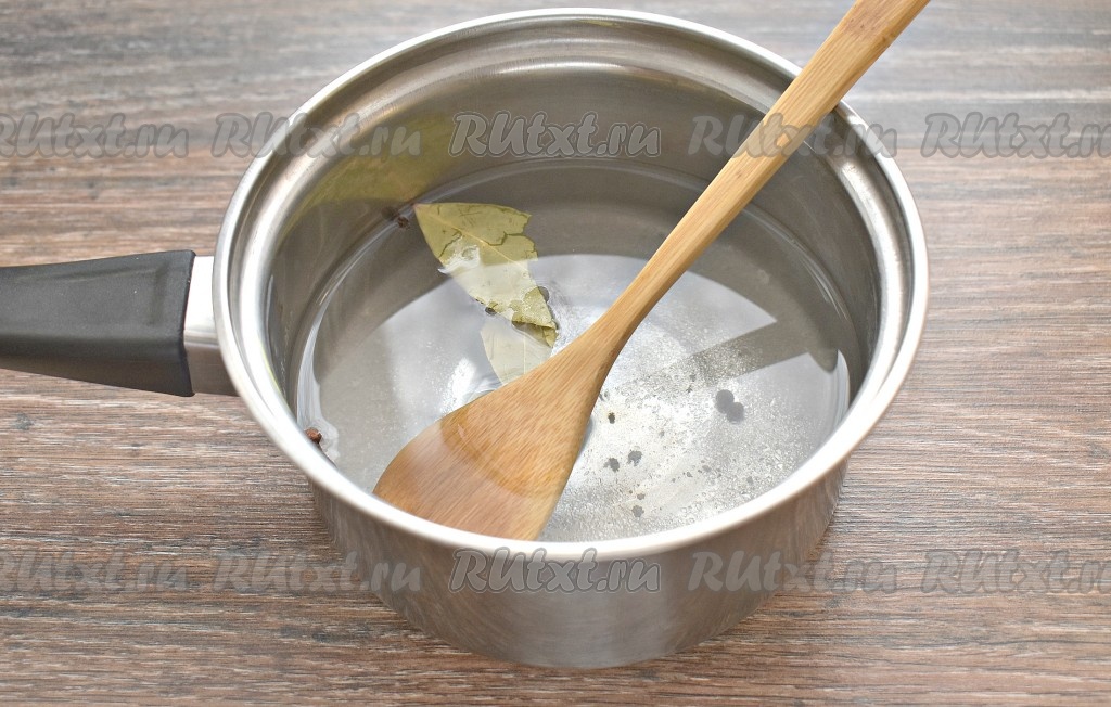 Если скумбрия заморожена, разморозьте её при комнатной температуре. Для приготовления рассола для засолки скумбрии вливаем в ковшик воду, всыпаем соль, горошины чёрного перца, сахар, бутоны гвоздики, лавровый лист и горошинки душистого перца. Доводим содержимое ковшика до кипения на среднем огне, провариваем рассол 2 минуты, а затем, сняв с огня, остужаем получившийся рассол до комнатной температуры.