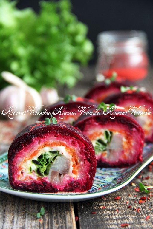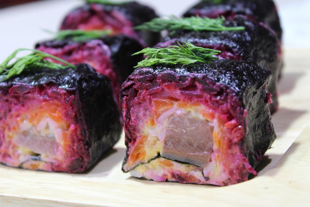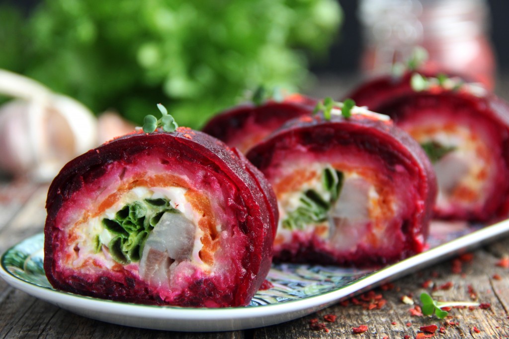 На праздничный стол можно приготовить любимый многими салат "Селёдка под шубой" в виде роллов. Формируются такие роллы достаточно просто, без нори. Закуска получается очень яркой, красивой и нежной. По вкусу эти роллы похожи на классическую "Селёдку под шубой", а вот вид у них просто потрясающий. Такая интересная закуска украсит любое праздничное застолье!