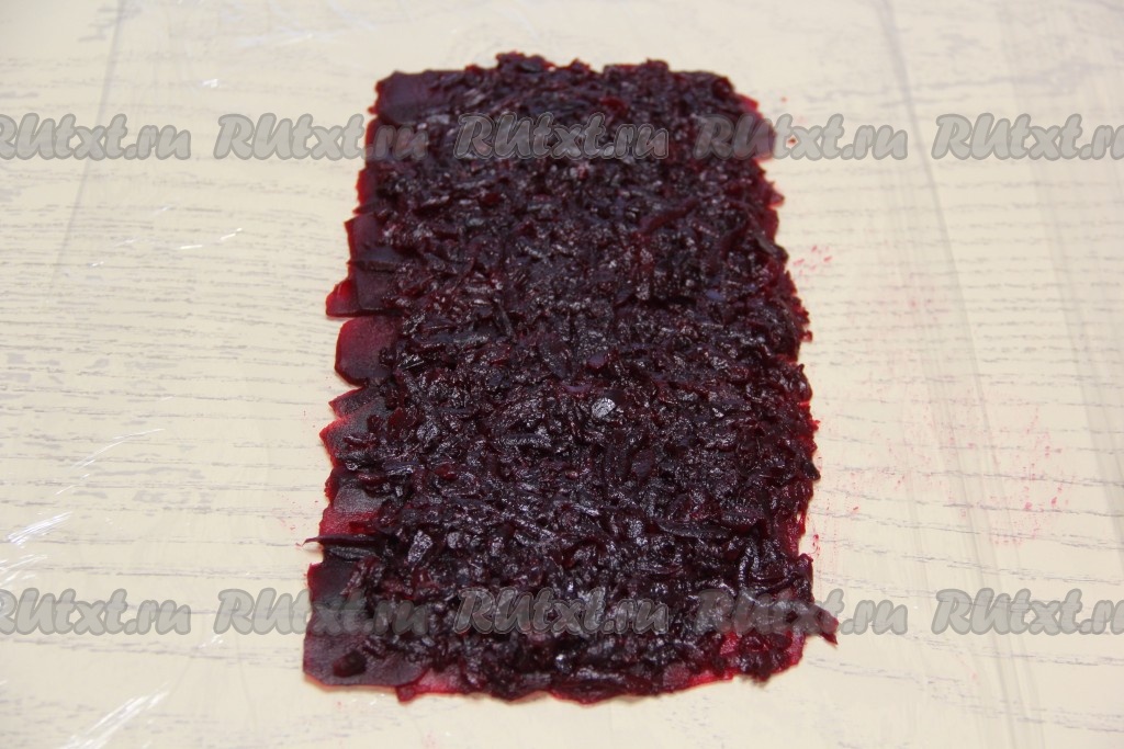 Остатки свеклы натереть на мелкой тёрке. Ингредиенты в дальнейшем будем выкладывать, немного отступив от одного из длинных краёв прямоугольника. Итак, немного отступив от одного из длинных краёв прямоугольника, выложить натёртую свеклу.