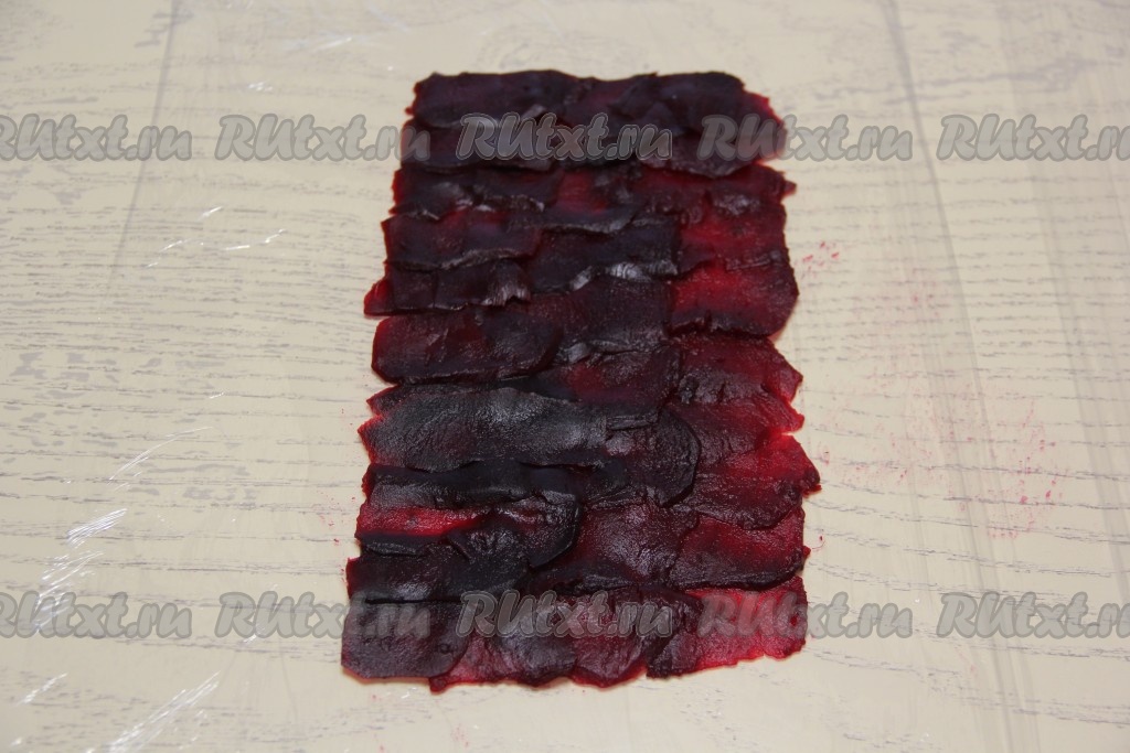 1-1,5 свеклы с помощью овощечистки нарезать на тонкие полоски - слайсы. Если вы нарежете 1,5 свеклы - рулет получится большего размера, если свекла достаточно крупная, то можно и одну свеколку нарезать на слайсы. Выложить на пищевую плёнку внахлёст слайсы свеклы в форме прямоугольника.