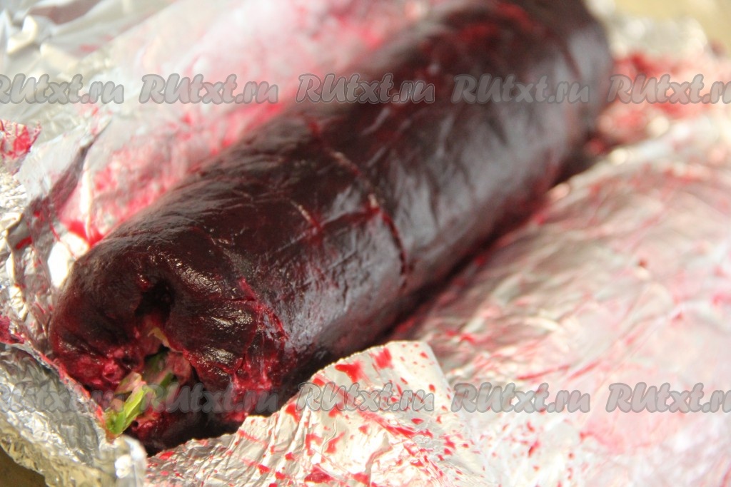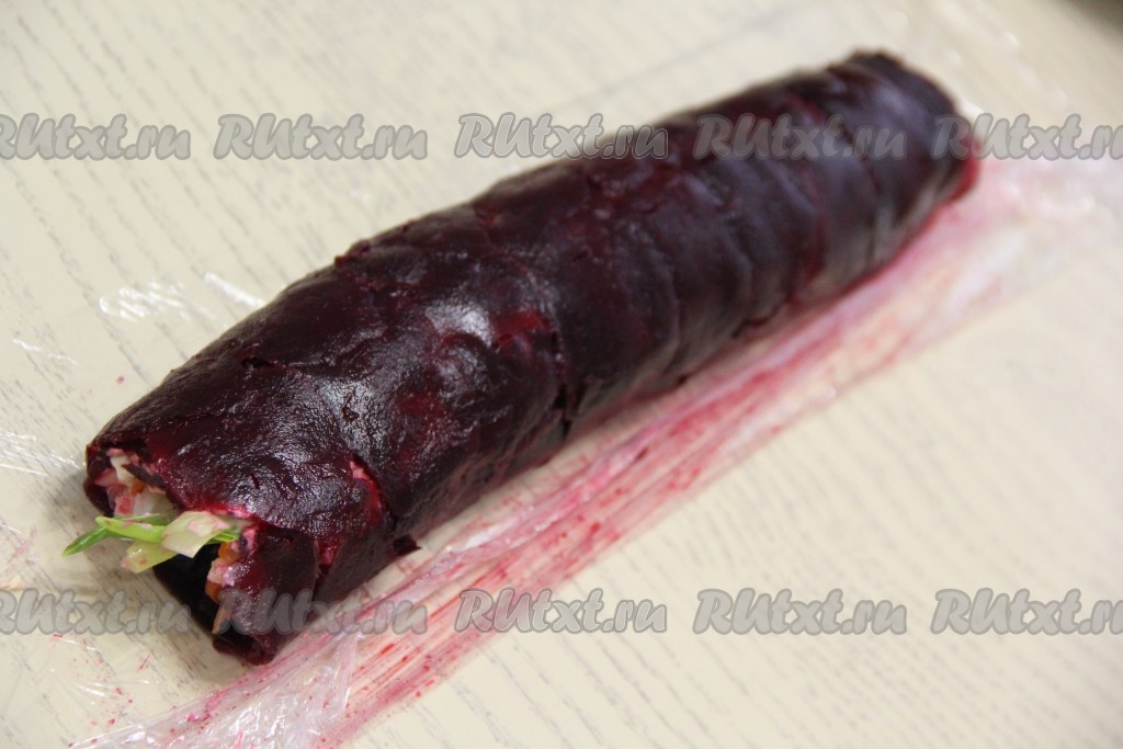 Начиная со стороны с сельдью и помогая себе пищевой плёнкой, свернуть закуску в плотный рулет.