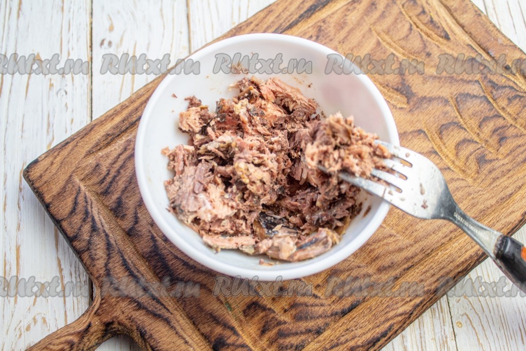С тунца слейте большую часть сока, саму рыбу разомните вилкой.