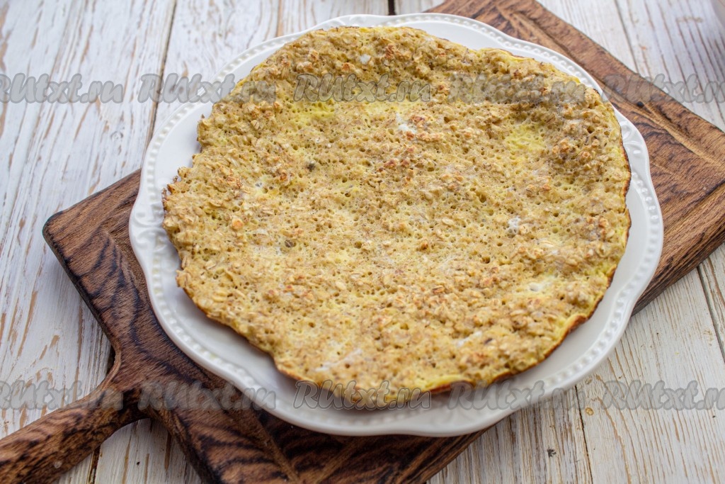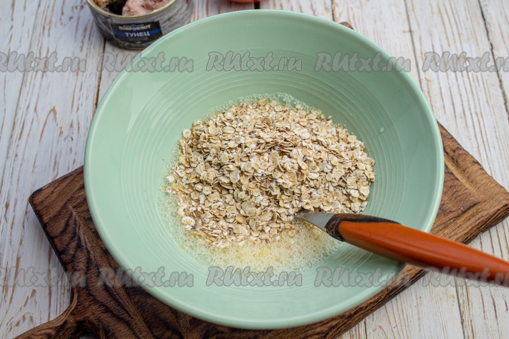 Добавьте овсяные хлопья, перемешайте. Тесто получится густым, по консистенции оно будет напоминать тесто для оладий.
