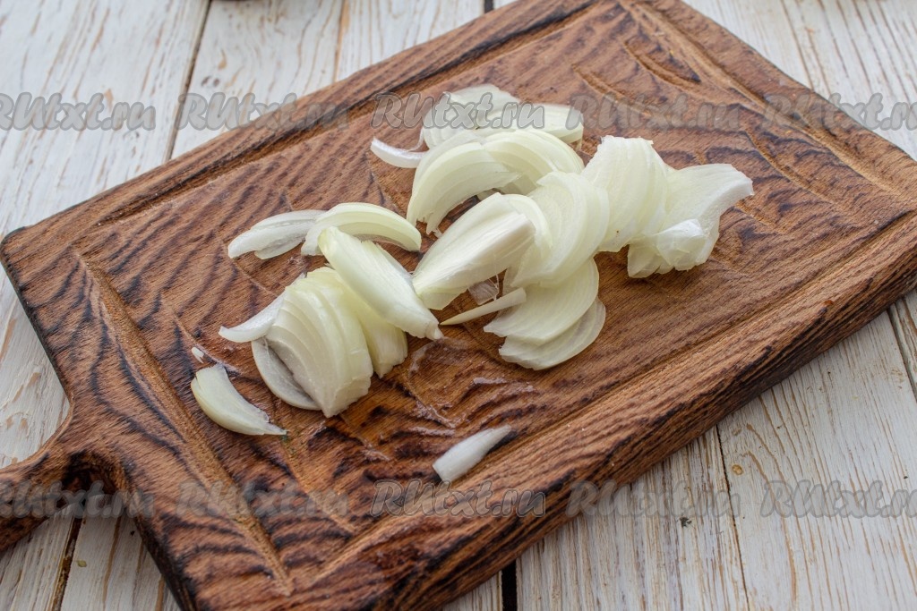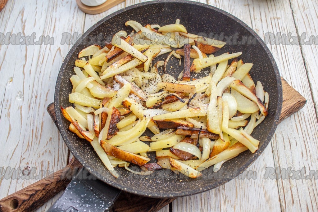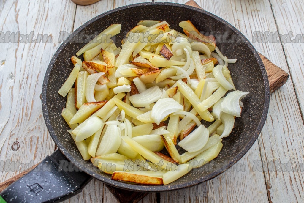 В сковороде нагрейте растительное масло, затем выложите нарезанную картошку и обжаривайте при большом нагреве около 5-7 минут (до румяности). Не забывайте периодически помешивать. Затем добавьте лук и обжаривайте ещё 3-4 минуты.