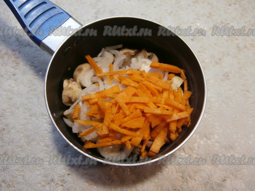 Нарезанный полукольцами лук, а также морковку, нарезанную соломкой (или натёртую на крупной тёрке), выложить в кастрюлю с грибами.