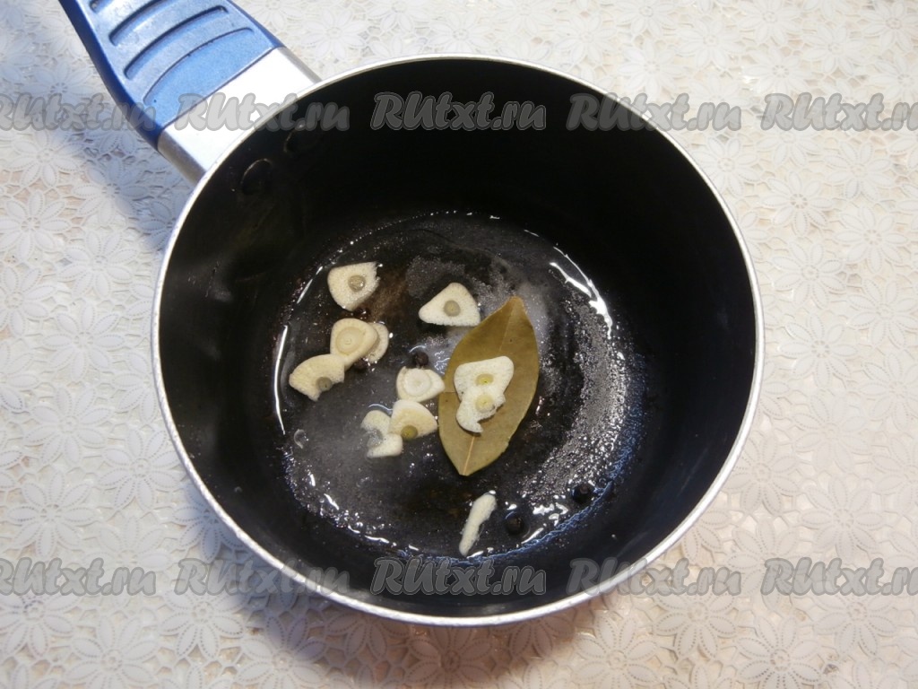 Лук, половину морковки и чеснок очистить. Шампиньоны заранее перебрать, срезать повреждённые места и промыть. Крупные шампиньоны разрезать на 2-4 части. В небольшую кастрюльку поместить чёрный перец горошком, нарезанный на пластины чеснок, лавровый лист, влить уксус и растительное масло, добавить соль и сахар.