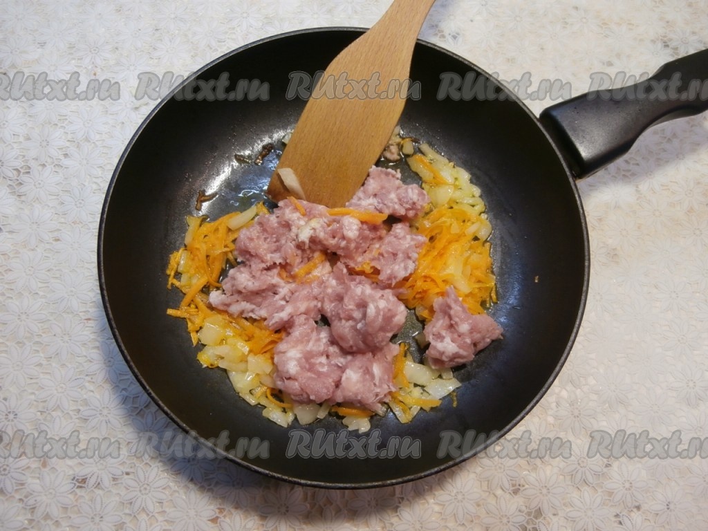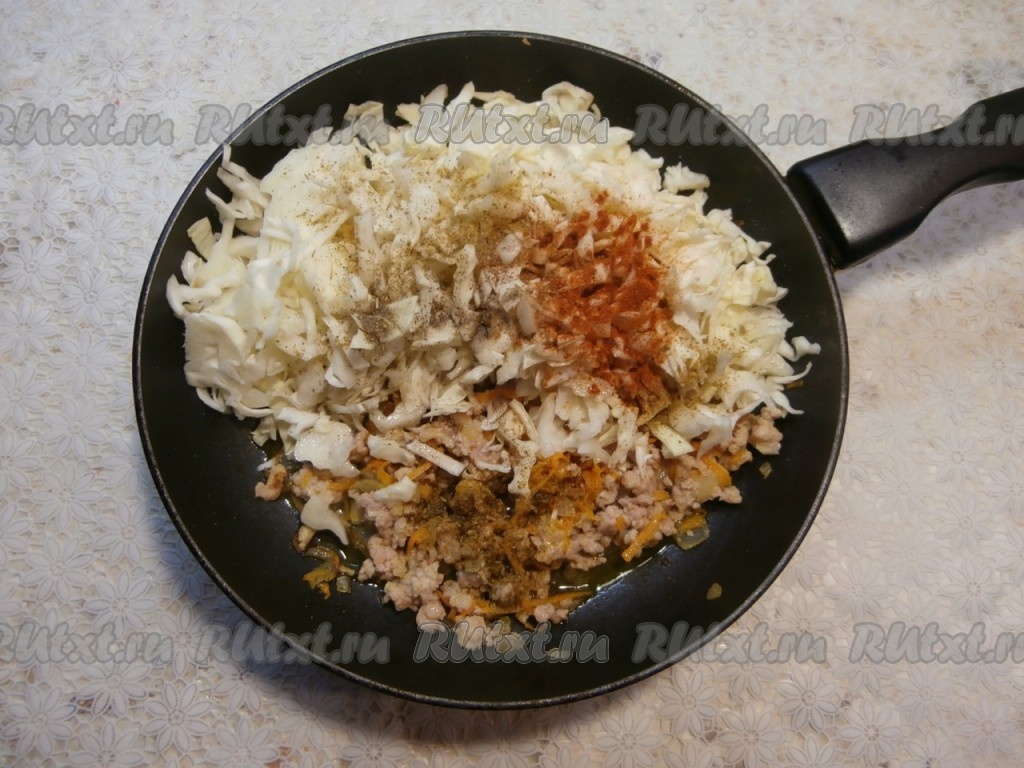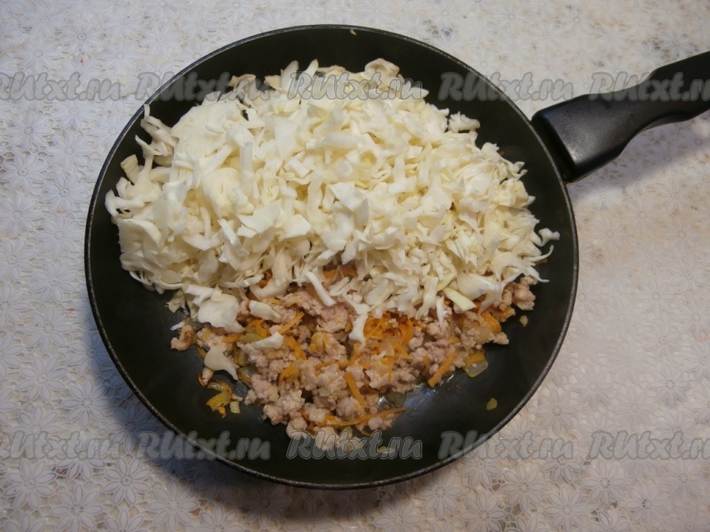 Перемешать и обжарить фарш до изменения цвета (в течение минут 6-7), периодически разбивая комочки мяса. Затем добавить в сковороду нашинкованную капусту.