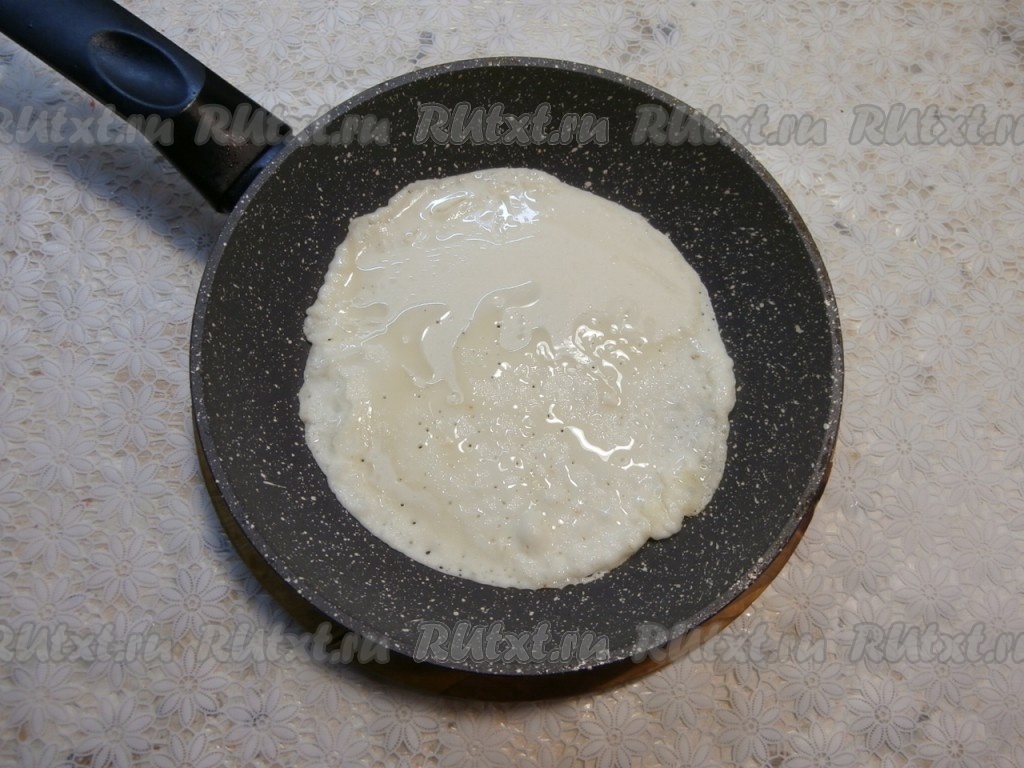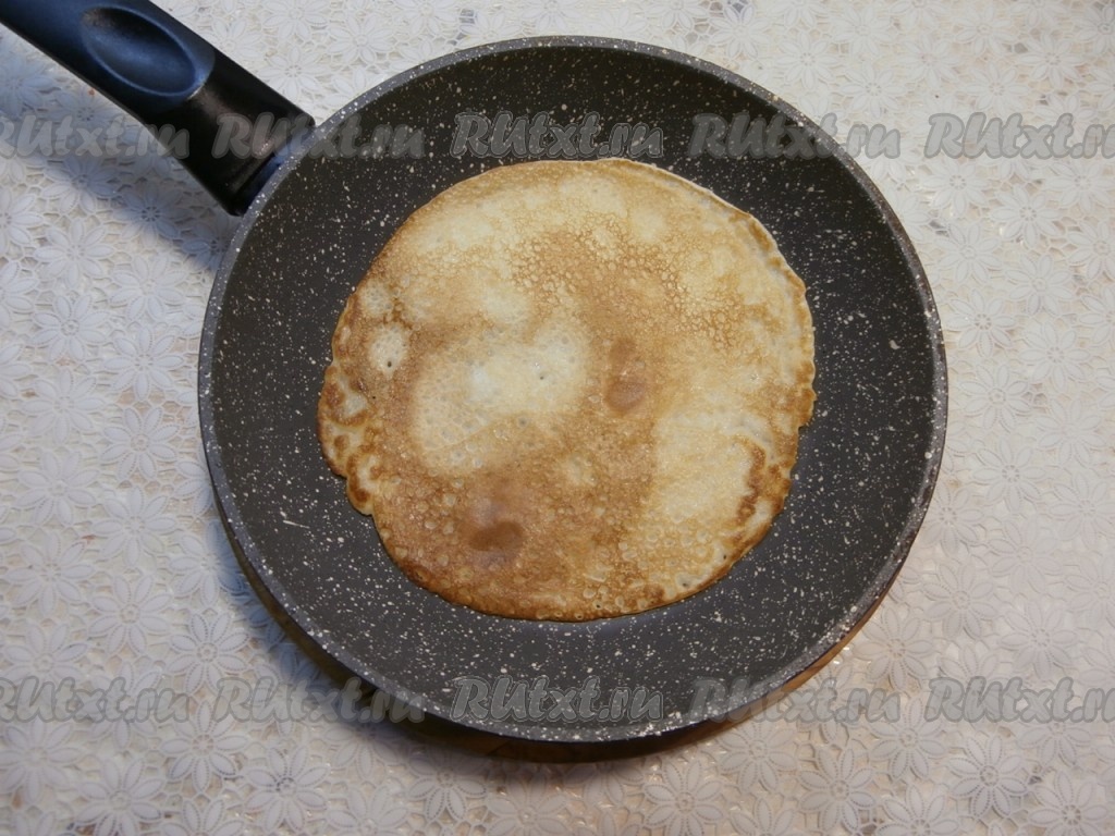 Пока начинка остывает, испечём блинчики. Перед жаркой первого блина хорошо раскалённую сковороду (у меня сковорода диаметром 20 см) желательно смазать растительным маслом. Налить на сковороду половник теста, равномерно распределяя его, жарить блин на огне чуть выше среднего до румяности.