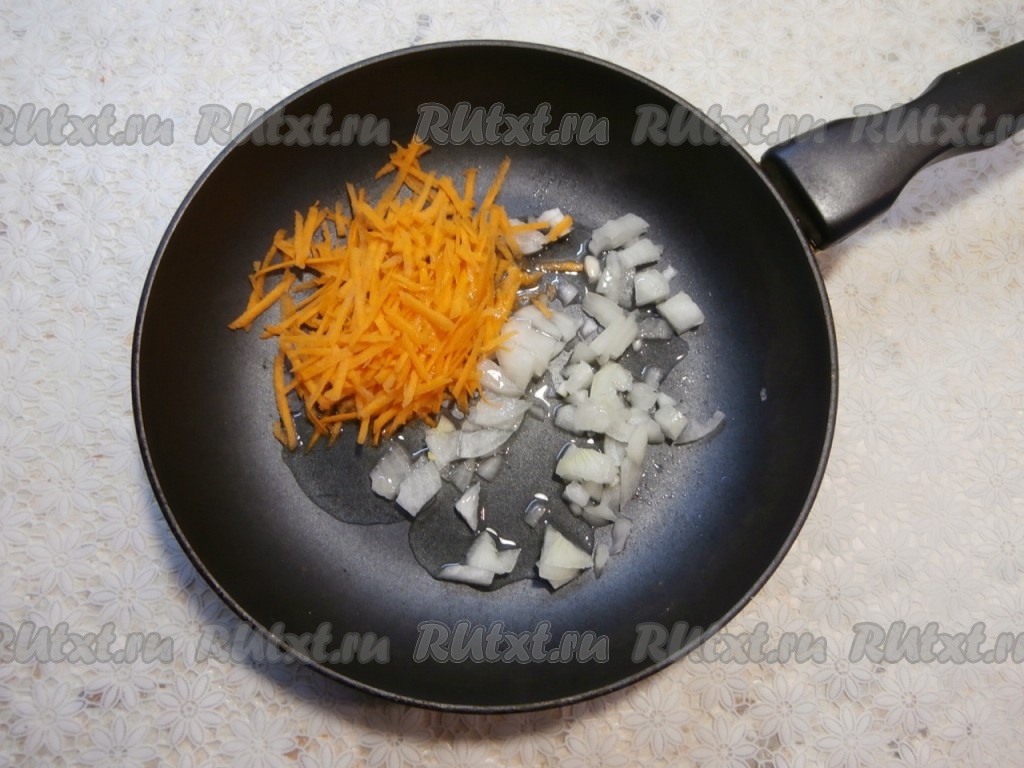 Лук и морковку очистить. Мелко нарезанную луковицу и натёртую на крупной тёрке морковку выложить на сковороду, прогретую с растительным маслом, и обжарить, помешивая, на умеренном огне до мягкости (в течение 4-5 минут).