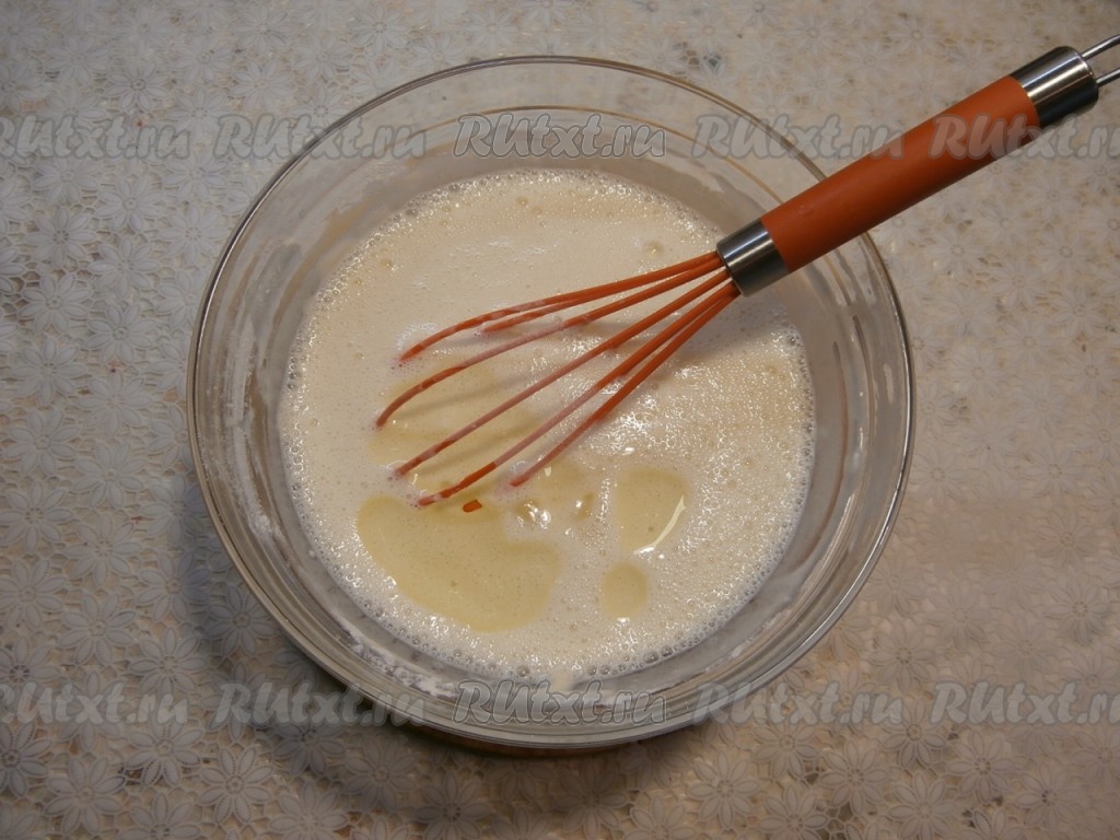 Перемешать венчиком, замешивая блинное тесто, затем влить растительное масло и ещё раз перемешать. Тесто получается не слишком жидким, но и не густым.