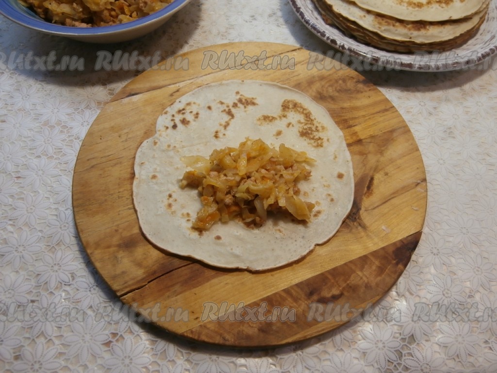 На каждый блин выложить по 1-2 столовых ложки начинки из капусты и фарша.