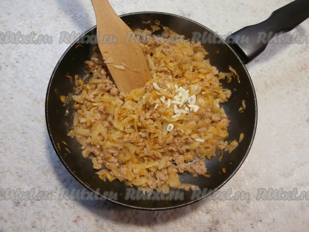 В сковороду выложить измельчённый чеснок, перемешать и протушить ещё 5-7 минут под крышкой (до полной готовности капусты), убрать с огня, дать остыть и капустно-мясная начинка для блинчиков готова.