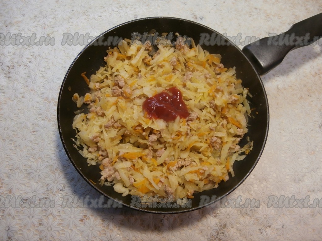 Влить воду, аккуратно перемешать. Накрыть сковороду крышкой и тушить капусту с фаршем на небольшом огне 15 минут, иногда перемешивая (капуста должна стать достаточно мягкой). Затем добавить 1 столовую ложку томатного соуса (или кетчупа), перемешать.