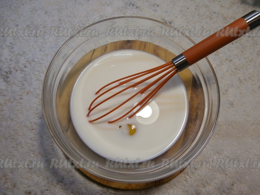 Вначале замесим блинное тесто, для этого нужно в глубокой миске тёплое молоко смешать с тёплой водой, добавить соль, сахар и сырое яйцо.