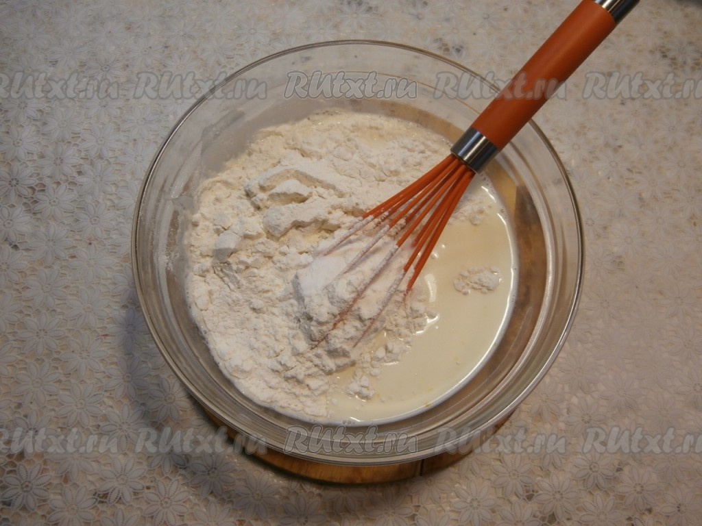 Тщательно перемешать содержимое миски венчиком, а после этого всыпать соду и муку.