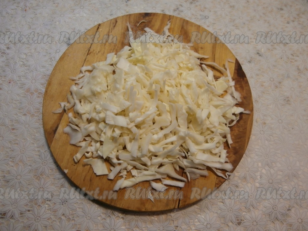 Теперь займёмся начинкой, для этого капусту нужно нашинковать, порубить немного ножом, чуть присолить, а затем помять руками.