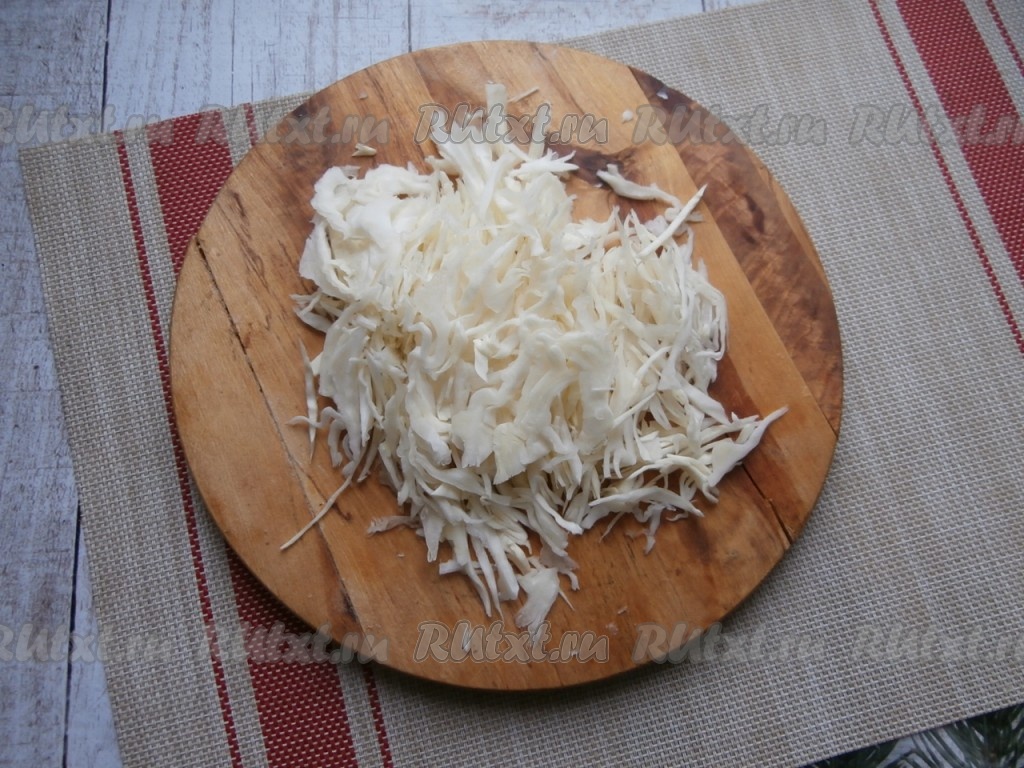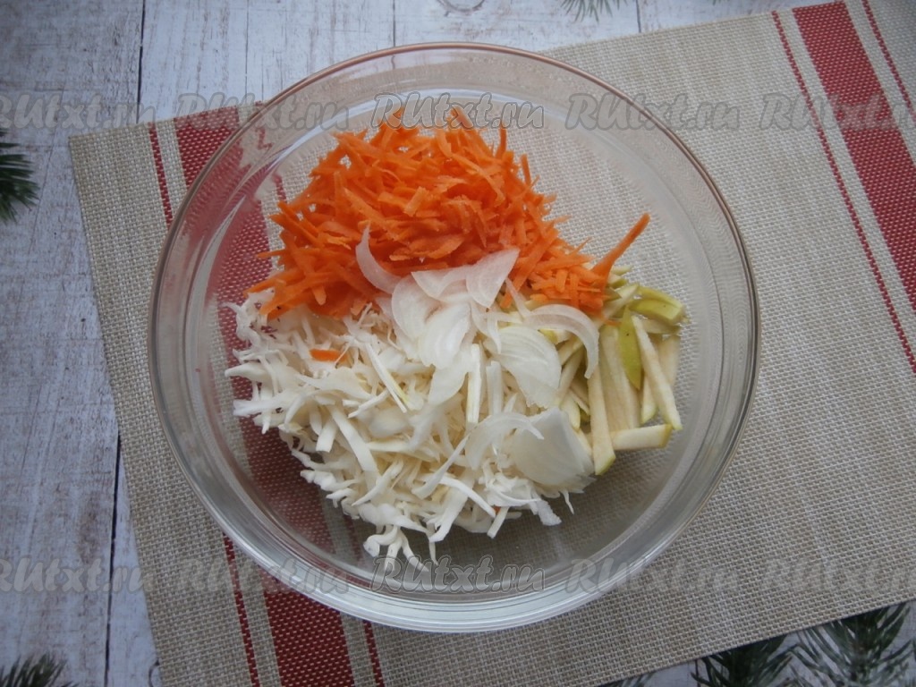Капусту, яблоко промыть водой. Лук и морковь почистить. Нарезать капусту на тонкие полоски.