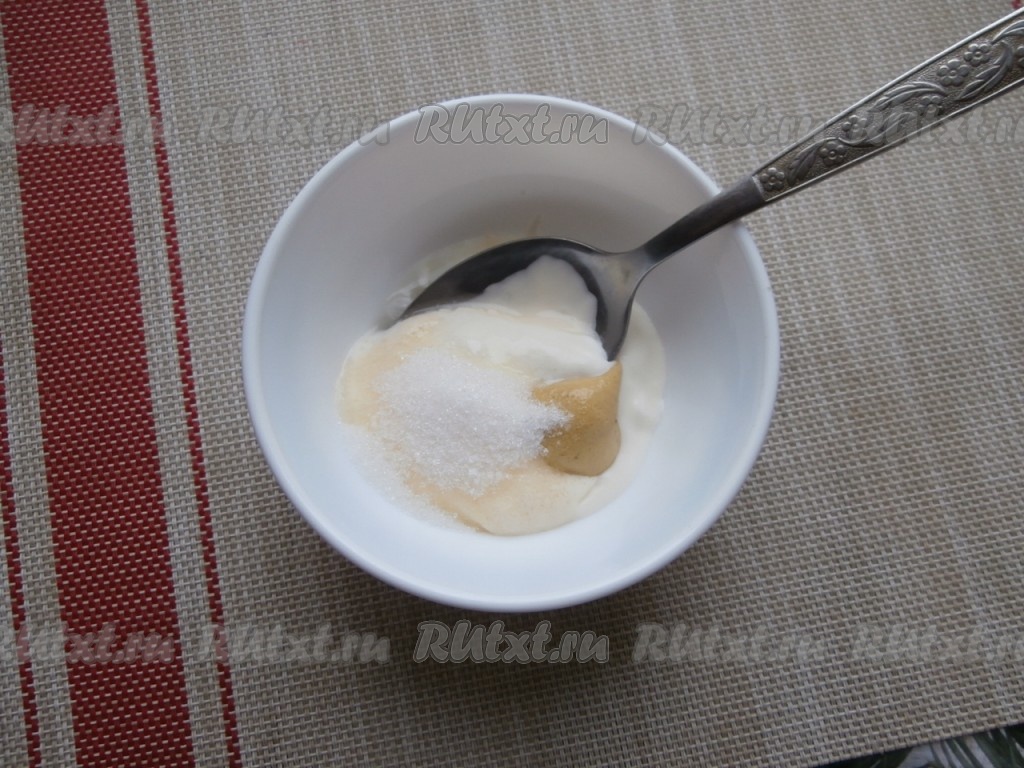 Для приготовления заправки выложить в пиалу сметану, добавить майонез, горчицу, сахар, влить лимонный сок, хорошо перемешать и заправка для салата "Коул Слоу" готова.