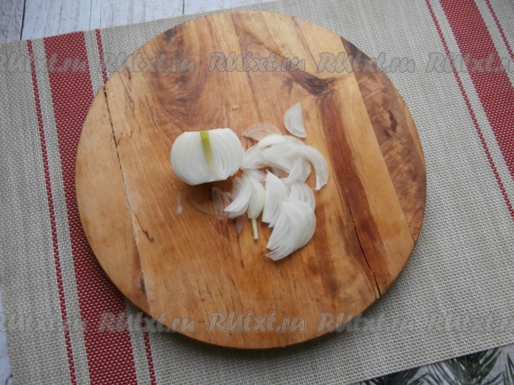 Половину луковицы нарезать на тонкие перья.