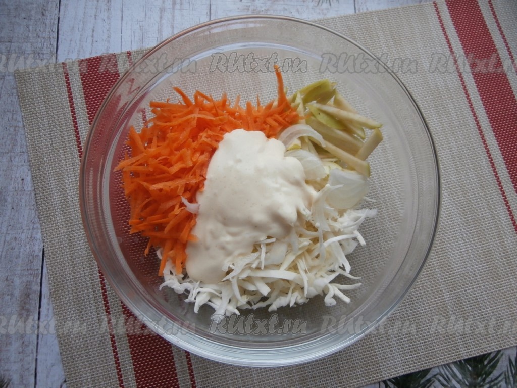В достаточно объёмной миске соединить капусту, морковку, яблоко и лук.