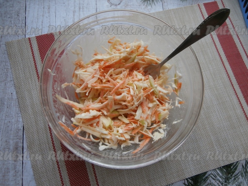 В миску с овощами и яблоком добавить получившуюся заправку, перемешать и подсолить салат по вкусу.
