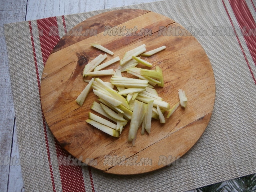 Яблоко (я взяла зелёное яблоко) очистить от семян и, по желанию, от кожуры (я не очищала), нарезать тонкой соломкой (или натереть на крупной тёрке).