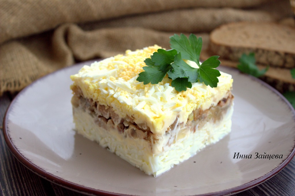 Выложить первым слоем половину белков, смешанных с плавленым сыром, слегка утрамбовать, сделать майонезную сеточку.