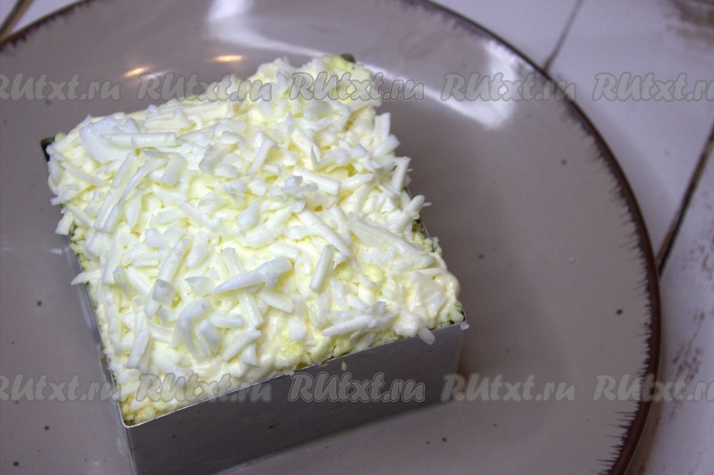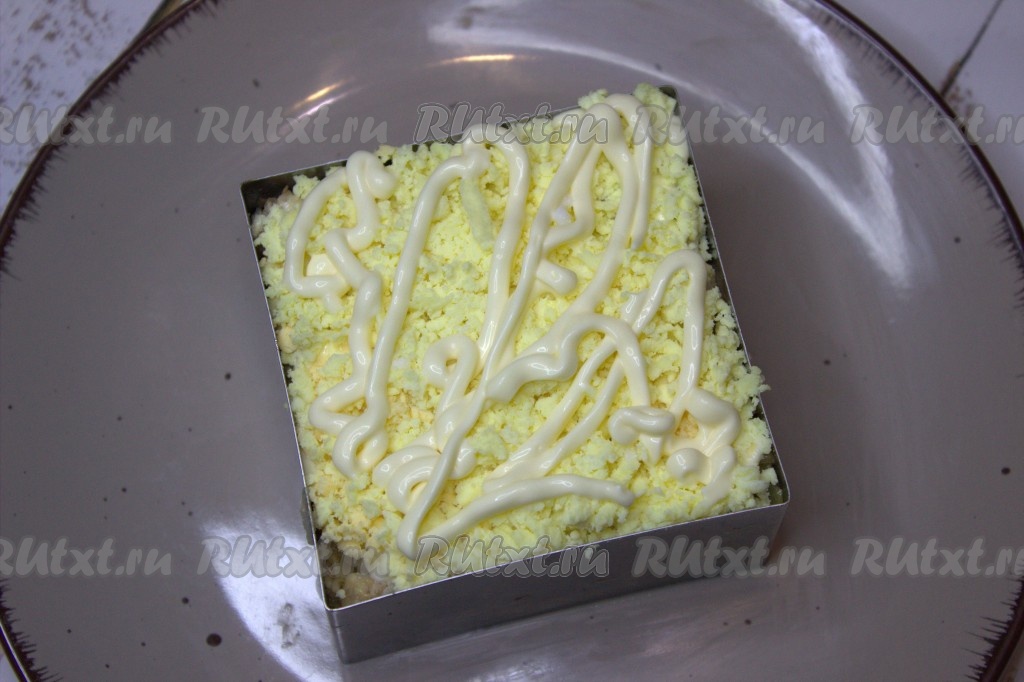 Далее вложить натёртый на тёрке желток (оставить немного желтка для украшения салата), нанести сеточку из майонеза.
