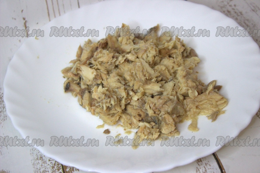 Баночку с консервированной горбушей открыть, жидкость из неё слить (она нам в этом салате не потребуется). Из рыбки удалить хребтовые кости, после этого размять горбушу вилкой.