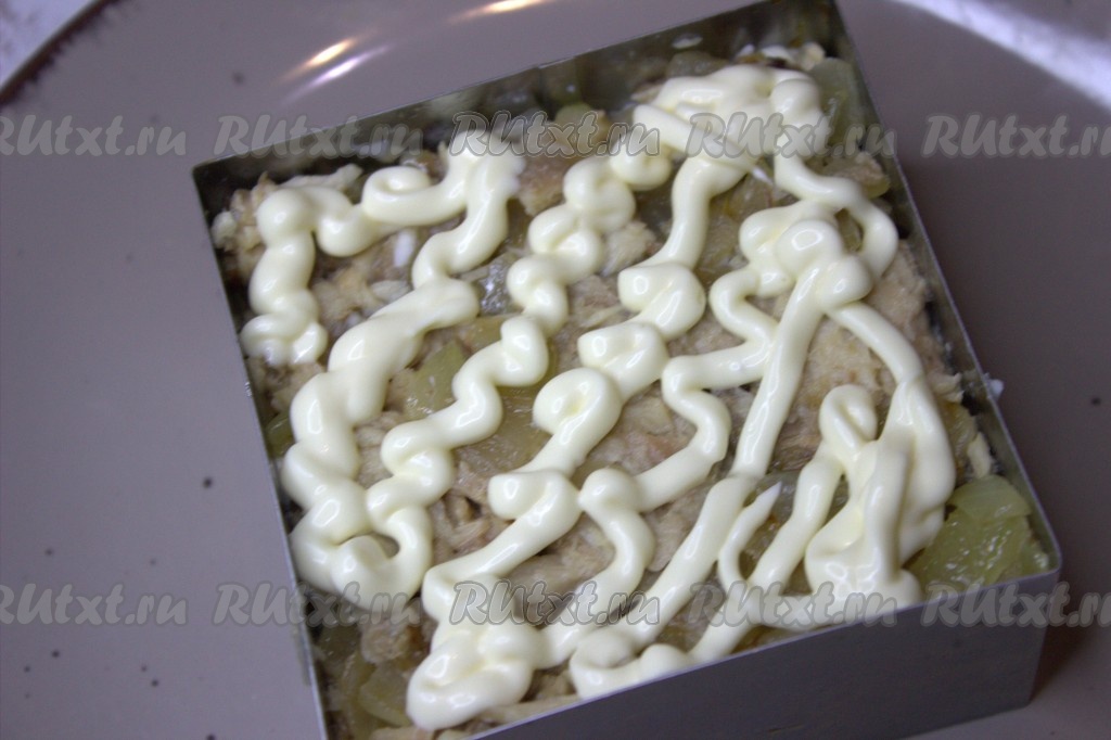 Этот рыбный салат нужно выкладывать слоями, удобнее всего это делать с помощью кулинарной формы. На плоскую тарелку поставить кулинарную форму, с помощью, которой будет формироваться салат. Внутри формы сделать майонезную сеточку.
