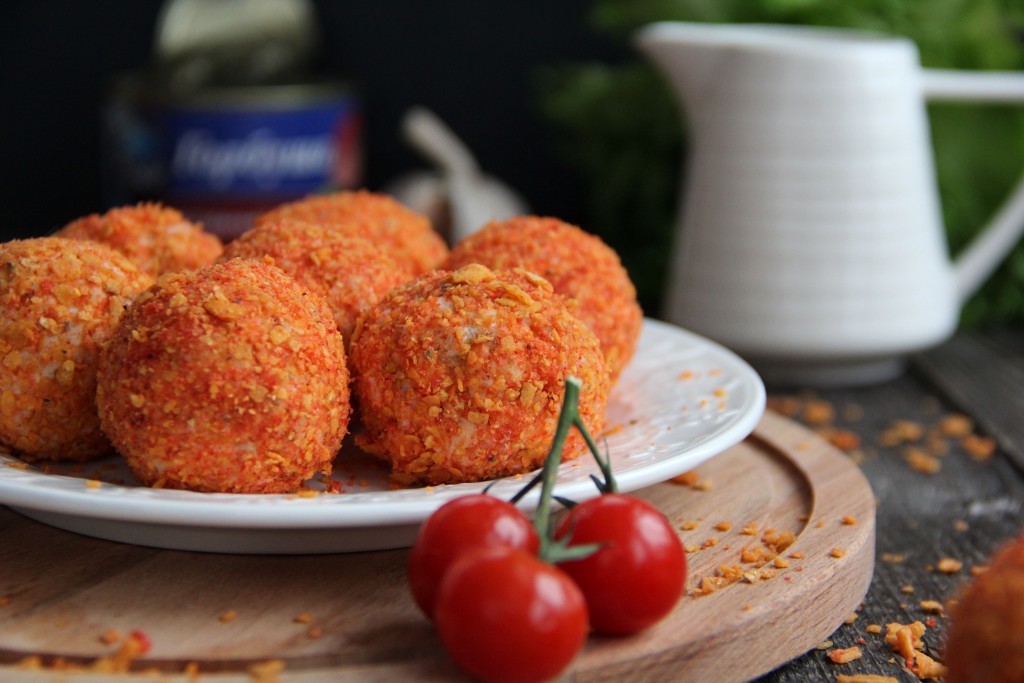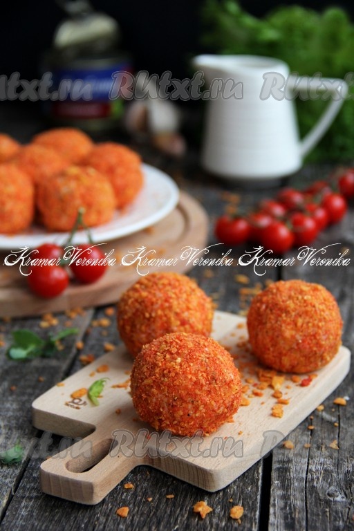 Из рыбной массы сформировать шарики любого размера (я сделала шарики размером чуть больше грецкого ореха) и обвалять со всех сторон в измельчённых чипсах. У меня получилось 17 штук.
